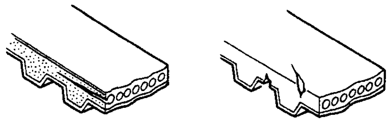 | Fig. 6: Worn teeth from excessive belt tension, camshaft or distributor not turning properly, or fluid leaking on the belt |