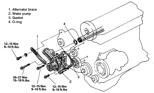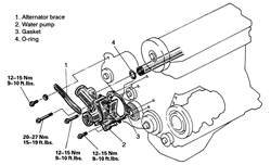 | Fig. 1: Water pump and related components — 2.4L engine |