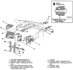 | Fig. 5: Exploded view of the heater housing, air conditioning evaporator housing and related components — Mitsubishi Montero Sport |