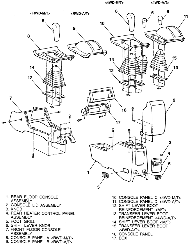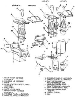| Fig. 1: Exploded view of the floor console and related components — Mitsubishi Montero Sport |