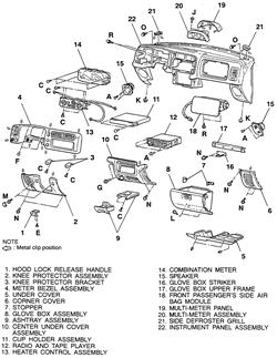 | Fig. 4: Exploded view of the instrument panel and related components — Mitsubishi Montero Sport |