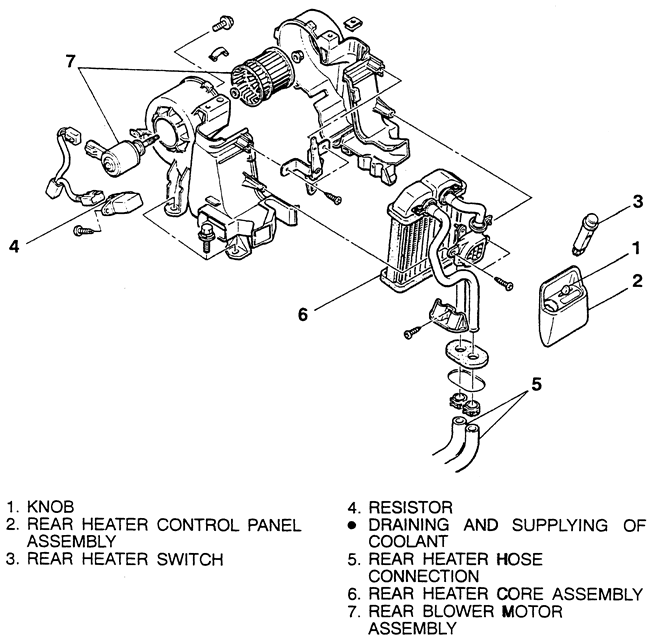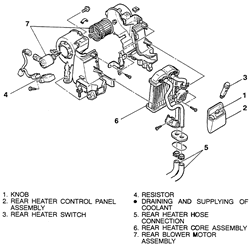 | Fig. 6: Exploded view of the rear heater core and related components — Mitsubishi Montero Sport |
