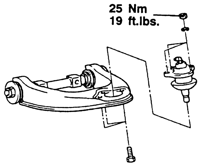 Install the ball joint in the upper control arm. Tighten the bolts to 18 ft. lbs. (25 Nm)