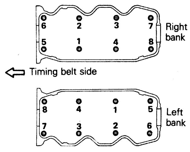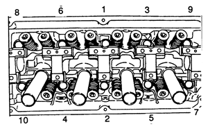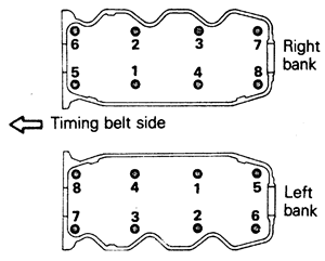 | Fig. 6: Cylinder head bolt tightening sequence — 3.0L engines |