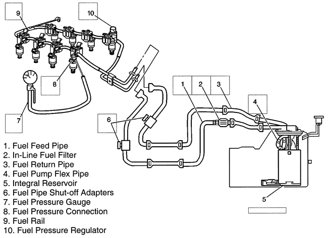 Fuel system circuit showing the pressure test port on the supply rail (typical)