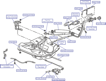 - Disconnect the filler hose, the vapor hoses, the fuel return hose, and the high-pressure fuel hose.