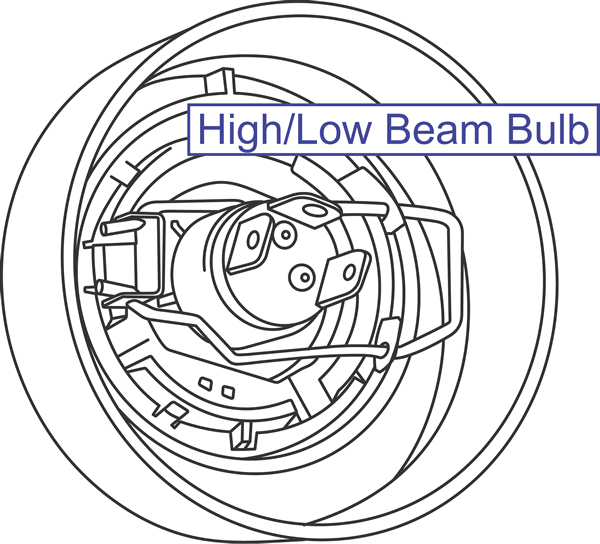 - To insert a high/low bulb, push the wire clip upward and back to retain the bulb assembly.