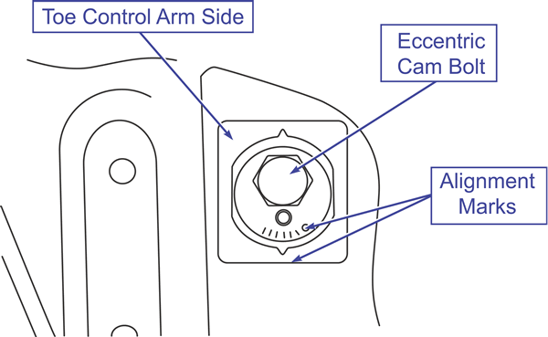 - Before removing the toe control arm assembly mounting bolt, make alignment marks on the toe control arm and eccentric cam bolt.