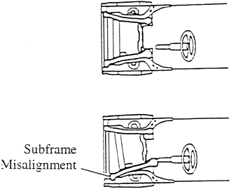 There are two types of frames commonly used, the ladder frame or full length frame and the subframe. Both frames are isolated from the body using rubber isolators. The subframe does not run the full length of the vehicle. The subframe supports the engine and transaxle. The subframe provides the mounting point for the front suspension lower control arms. Any misalignment of the subframe (accident damage, improperly performed heavy engine work where the subframe is loosened, lowered and/or removed, etc.) causes a misalignment of the front wheels. Movement of the subframe usually causes an increase in caster on one side of the vehicle and decrease in caster on the other side. This can cause the exhaust system to bind up, problems with control cables and unacceptable noise. Check the frame/subframe for any obvious damage, especially on a used vehicle with an unknown history.