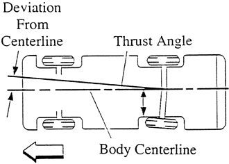 The front wheels aim or steer the vehicle. The rear wheels control tracking. This tracking action relates to the thrust angle. The thrust angle is the path that the rear wheels take. Ideally the thrust angle is geometrically aligned with the body centerline. If, for example, the toe-in on the left rear wheel is out of specification, it moves the thrust line off center. The resulting deviation from the centerline is the thrust angle.