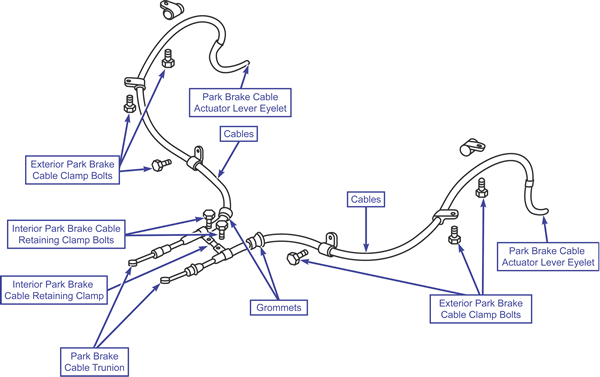 - Install the exterior park brake cable clamp bolts.
