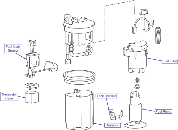 - Disconnect the wiring and fuel lines from the top of the fuel pump module.