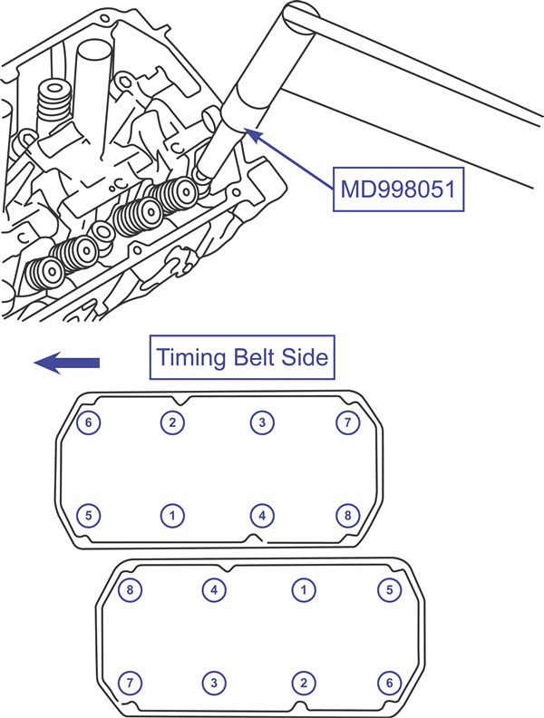 - Use a cylinder head bolt wrench such as MB991654 to tighten the bolts to 58 ft-lbs (78 Nm) in the sequence shown.