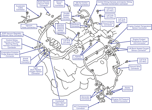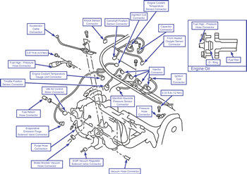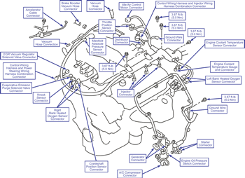 - Install the engine assembly and make sure all hoses, cables, and harness connectors are not pinched or bent.