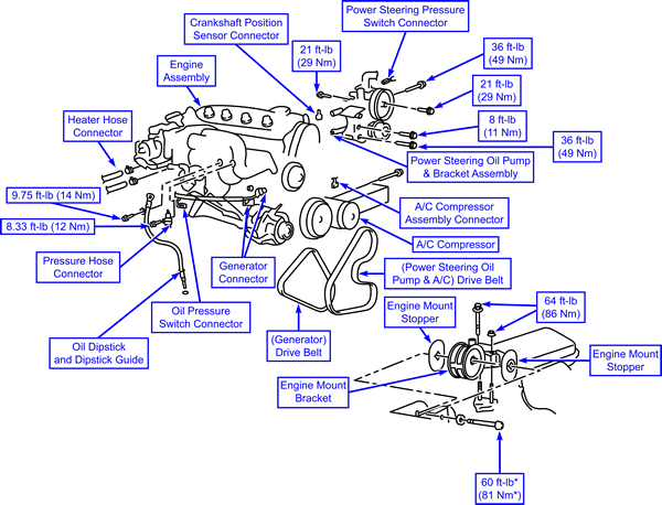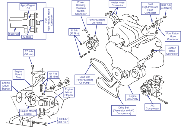 Parts marked with * should be hand-tightened initially, then completely tightened once the vehicle is on the ground with the full engine weight on the vehicle body.