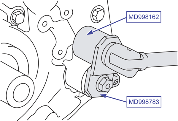 26. To remove the counterbalance shaft (rear bearing) (right) and the counterbalance shaft (rear bearing) (left), install a bearing installer stopper (special tool #MB991603) and silent shaft bearing puller (special tool #MD998372) in front of the cylinder block when removing the left counterbalance shaft rear bearing. Next use the silent shaft bearing puller to remove the right counterbalance shaft rear bearing from the cylinder block.
