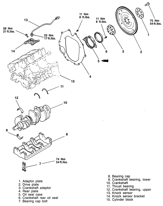 | Fig. 2: Exploded view of the crankshaft, rear main seal and related components-3.5L engine shown; 3.0L engine is similar |