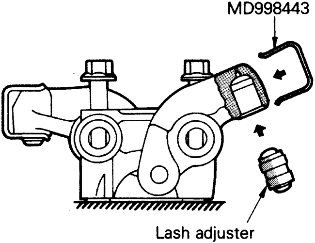 | Fig. 1: Insert the Lash Adjuster Holder tool MD998443 to prevent the lash adjuster from falling out-2.4L engines |