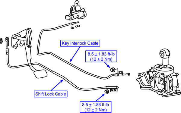NOTE: The center console must be removed to access both cables and the steering column covers must be removed to access the key interlock cable.