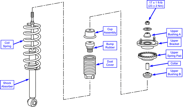 Compress the coil spring with a suitable spring compressor before removing the nut from the piston rod. Do not use air tools to remove the nut. The vibration may cause the spring to come loose from the compressor causing personal injury.