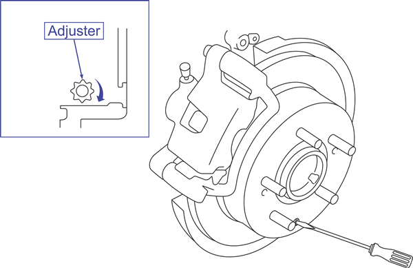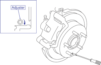 Rotate the adjuster with a flat-tip screwdriver in the direction shown to expand the brake shoes against the drum so the drum will not turn.