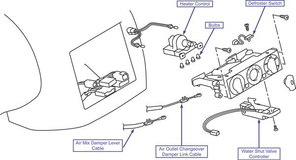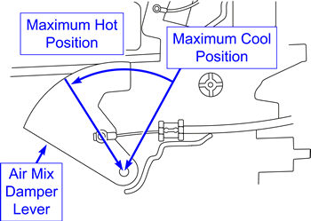 Set the air mix damper lever of the heater/cooler unit to the maximum hot position as shown in the illustration, and then connect the cable to the lever pin.