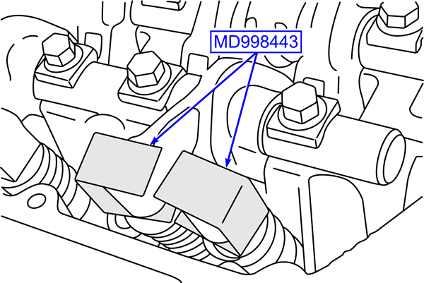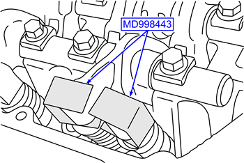 Step 1: Use special tool #MD998443 as seen in the illustration so that the lash adjusters will not fall out.
