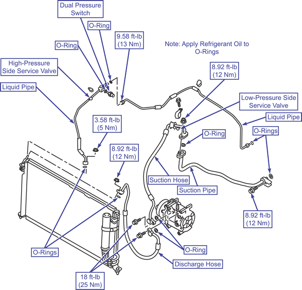 NOTE: Recover the refrigerant from the A/C system before disconnecting the refrigerant lines.
