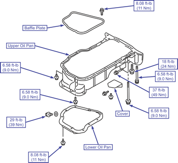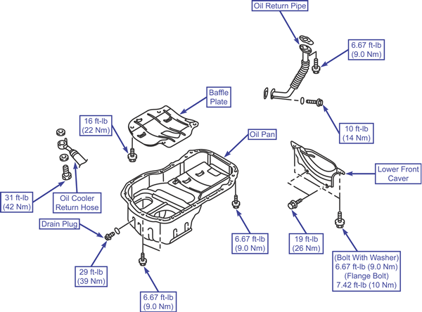 - Step 4: Tighten the engine oil pan mounting bolts to 80 in-lbs (9.0 Nm). When installing the engine oil pan mounting bolts (M6 x 8 mm), note that they have different lengths from the other bolts.