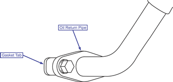 Remove the turbocharger oil return pipe and gasket. Note the direction of the tab on the gasket.