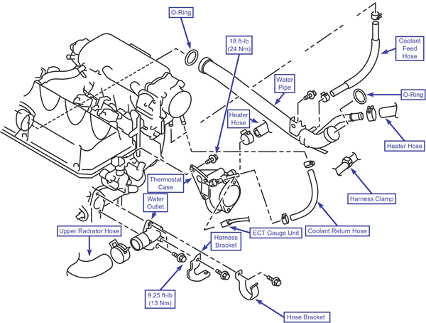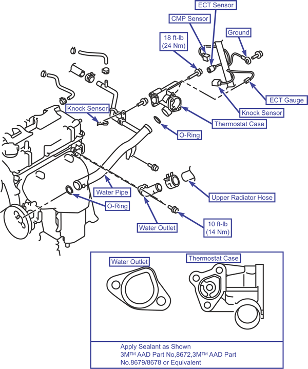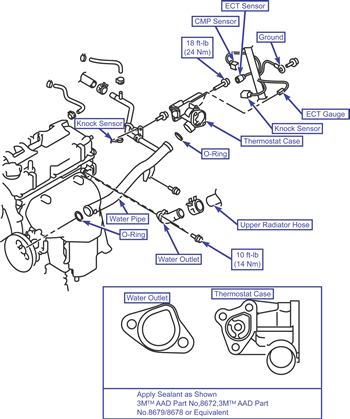 Install the thermostat case assembly. Make sure to apply sealant to the thermostat case, bolt threads and bolt flange.