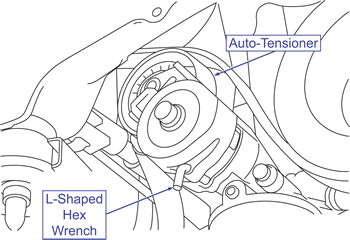 Insert a suitable breaker bar into the drive belt tensioner and rotate the tensioner counterclockwise until an "L" shaped tool such as a hex wrench can be inserted through the holes in the tensioner as shown.