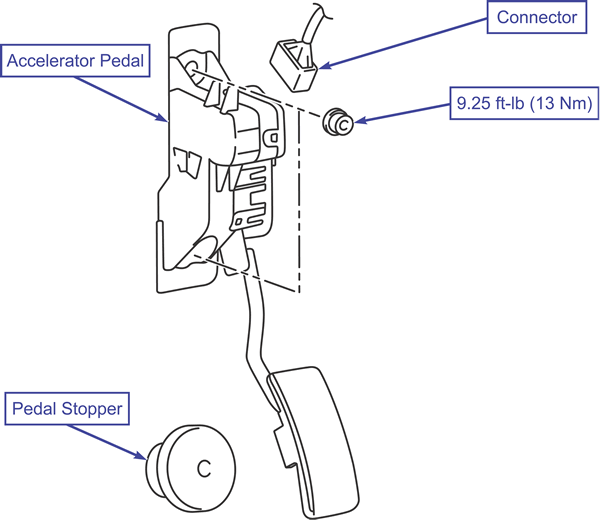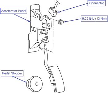 NOTE: The accelerator pedal stopper screws on to a stud.