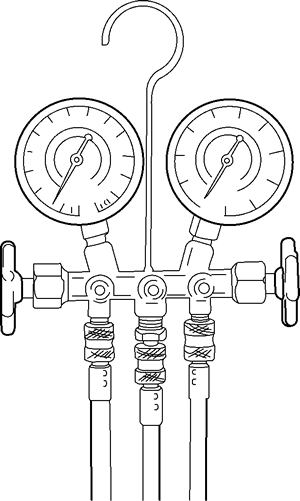 A/C system service requires the use of a manifold gauge set with vacuum pump or a refrigerant recovery/recycling station. The best way to determine if the system has a leak is to evacuate the refrigerant from the vehicle into a refrigerant recovery/recycling station. Once the refrigerant has been recovered the refrigerant recovery/recycling station will pull a vacuum on the system. Isolate the A/C system by closing the valves when the vacuum reaches -26 in. Hg (-88 kPa). A leak free system should be able to hold vacuum for at least 15 minutes or more. If you can not reach the vacuum specified, air is leaking into the system, and the source must be located and repaired.