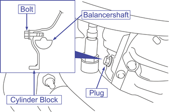 - Remove the bolt from the balance shaft inspection hole and install the plug.