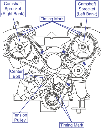 - Turn the right camshaft sprocket counterclockwise to take up slack in the belt.