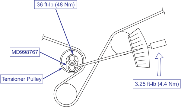 | Apply a force of 31 in-lbs (3.5 Nm) to the tension pulley (2.4L)