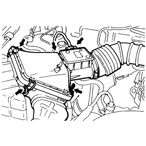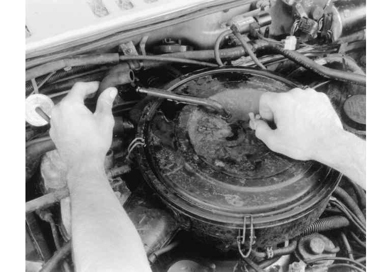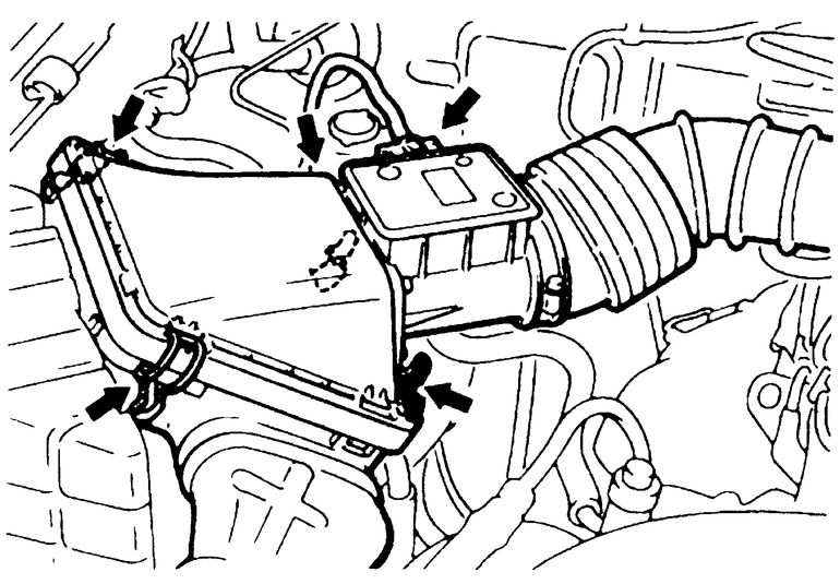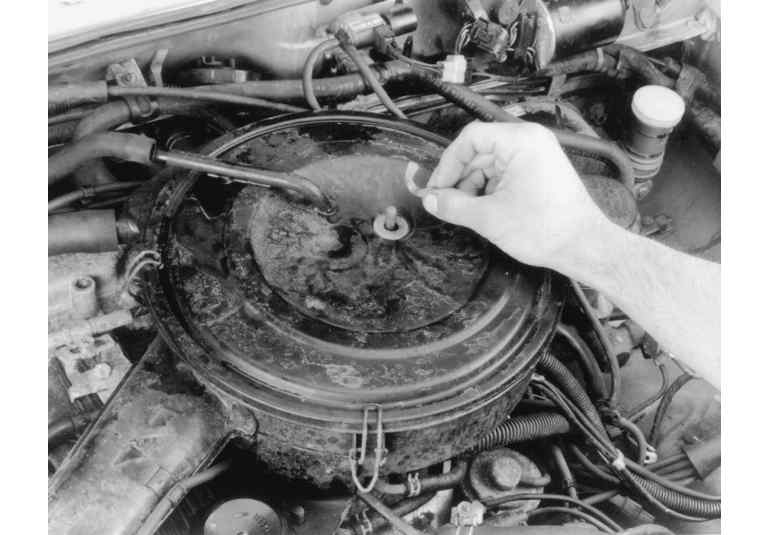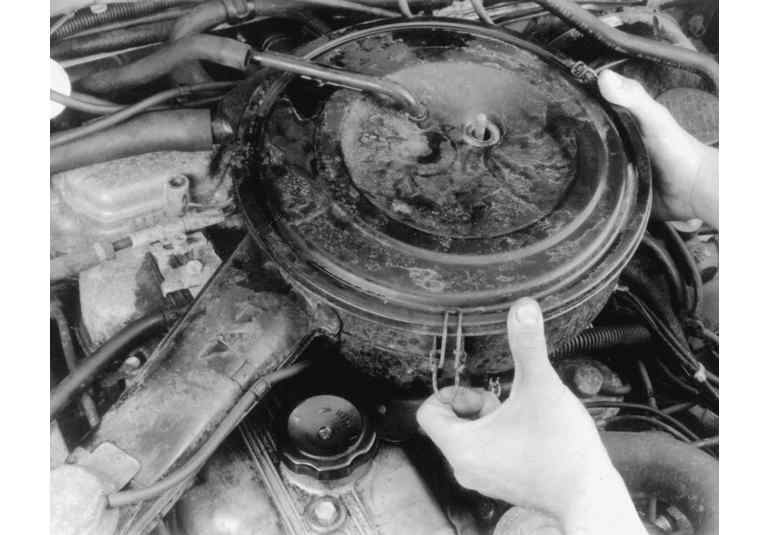 | Fig. 3: Unsnap the three retaining clips from around the air cleaner assembly |