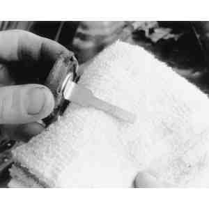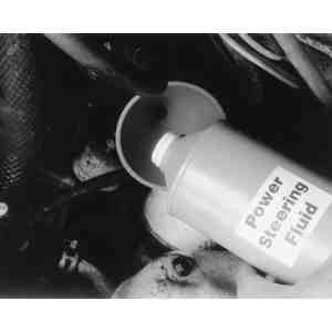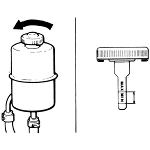 Park the vehicle on a flat, level surface and leave the engine running. Turn the steering wheel several times to the left and right to raise the fluid to normal operating temperature. With the engine running, remove the cap from the power steering fluid reservoir. This unit is separate from the pump but connected to it by hoses. There are MAX and MIN marks on the dipstick connected to the cap. Add DEXRON® II automatic transmission fluid to the reservoir to bring the level up to the maximum.