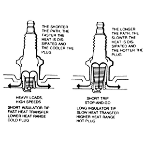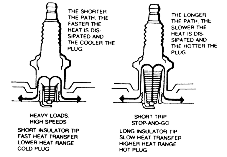 There are many spark plugs suitable for use in your engine and are offered in a number of different heat ranges. The amount of heat which the plug absorbs is determined by the length of the lower insulator. The longer the insulator the hotter the plug will operate; the shorter the insulator, the cooler it will operate. A spark plug that absorbs (or retains) little heat and remains too cool will accumulate deposits of lead, oil, and carbon, because it is not hot enough to burn them off. This leads to fouling and consequent misfiring. A spark plug that absorbs too much heat will have no deposits, but the electrodes will burn away quickly and, in some cases, pre-ignition may result. Pre-ignition occurs when the spark plug tips get so hot that they ignite the air/fuel mixture before the actual spark fires. This premature ignition will usually cause a pinging sound under conditions of low speed and heavy load. In severe cases, the heat may become high enough to start the air/fuel mixture burning throughout the combustion chamber rather than just to the front of the plug. In this case, the resultant explosion will be strong enough to damage pistons, rings, and valves.