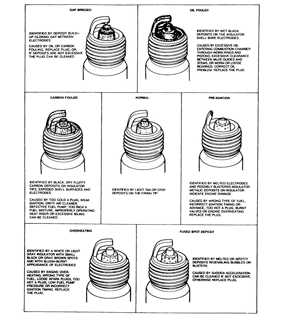 When you remove the spark plugs, check their condition. They are a good indicator of the condition of the engine. A small deposit of light tan or gray material on a spark plug that has been used for any period of time is to be considered normal. Any other color, or abnormal amounts of deposit, indicates that there may be something wrong in the engine.