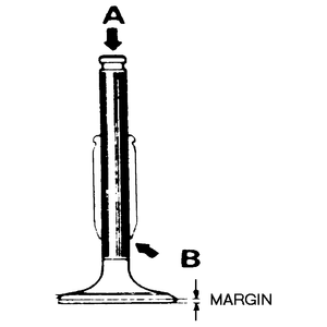 Inspect the valve margin for adequate thickness. This is the vertical section of the valve head below the seating surface. The margin is just that — a thickness of metal giving strength to the valve head.
