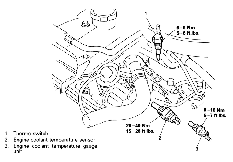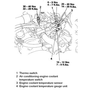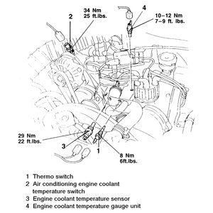 | Fig. 1: Coolant system sensor locations — 2.0L