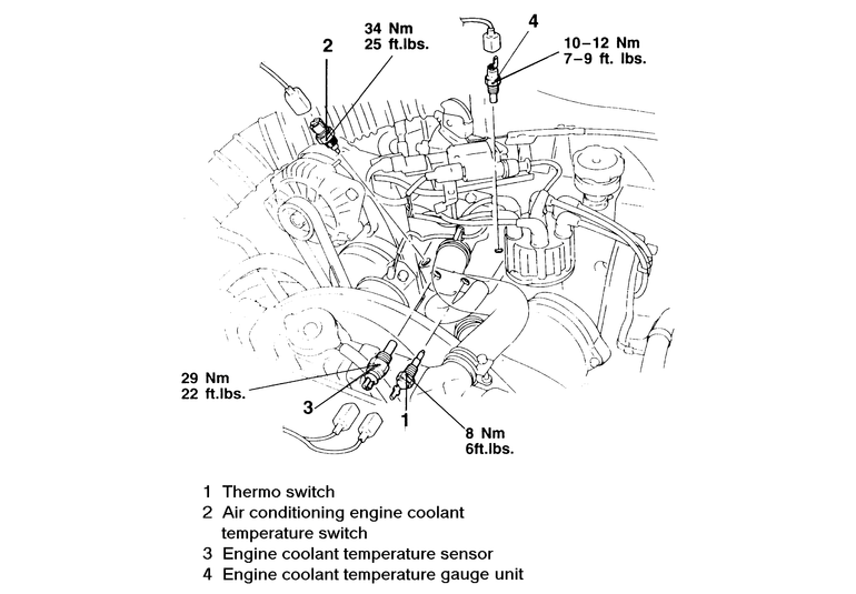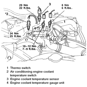 | Fig. 2: Coolant system sensor locations — 2.4L