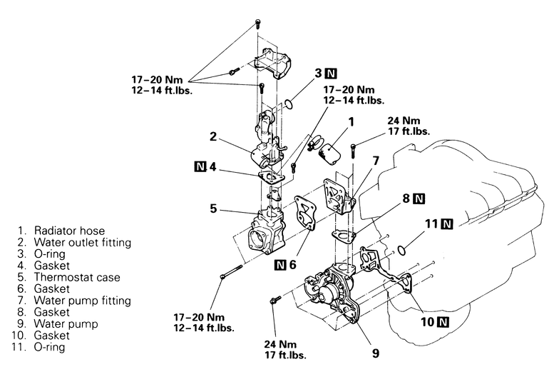 - Install the water pump and tighten its bolts to 17 ft. lbs. (24 Nm) in two