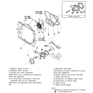 - Install the pulley and fan assembly onto the water pump. Tighten the nuts