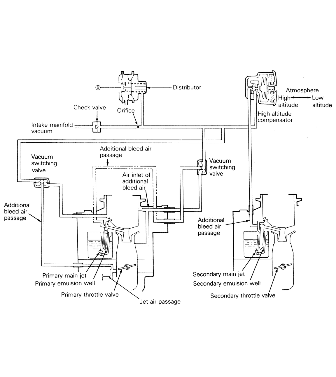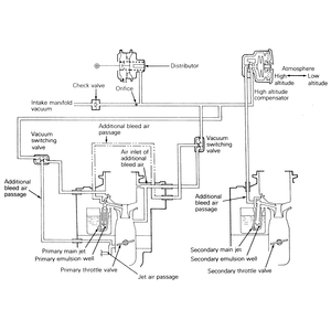 At high altitude, this high altitude compensation system supplies additional bleed air to the carburetor emulsion well and jet air passage to dilute the fuel, preventing an over-rich air-fuel mixture caused by the drop of air density at high altitudes.