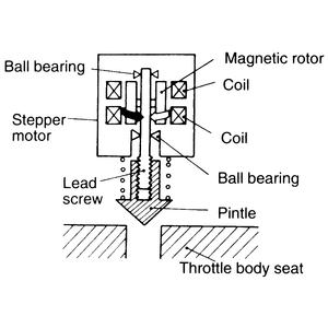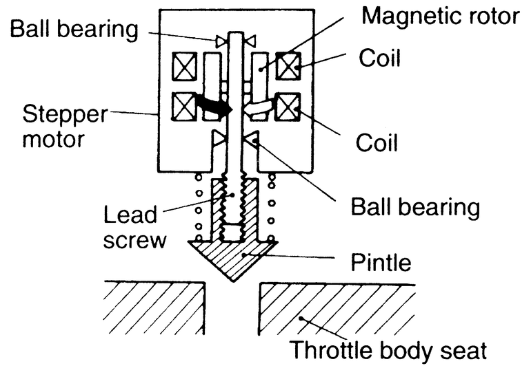 The amount of air taken in during idling is regulated by the opening and closing of the servo valve located in the air passage that bypasses the throttle valve. The servo valve is opened or closed by the activation of the stepper motor (incorporated within the idle air control motor) in the forward or reverse (clockwise or counter-clockwise) direction. Battery positive (+) voltage is supplied, by way of the MFI relay, to the coil of the stepper motor. The ECM switches the power transistors on (located within the ECM) in sequential order, and, when current floes to the stepper motor coil, the stepper motor is activated in the forward or reverse direction.