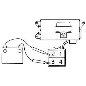 To test the secondary air control solenoid valve, label and remove the vacuum hoses, taking note of the location of each. Generally, the hoses are marked with a blue, yellow and white stripe OR a green stripe and a white stripe or a red stripe. Attach the vacuum pump to the port which contained the red striped hose. Use jumper wires to bridge battery voltage to the terminals. The 4-cylinder Pick-up and Montero use a four conductor plug; apply the voltage to terminals 2 and 3.