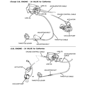 | Fig. 4: Accelerator cable location and assembly components — 3.0L